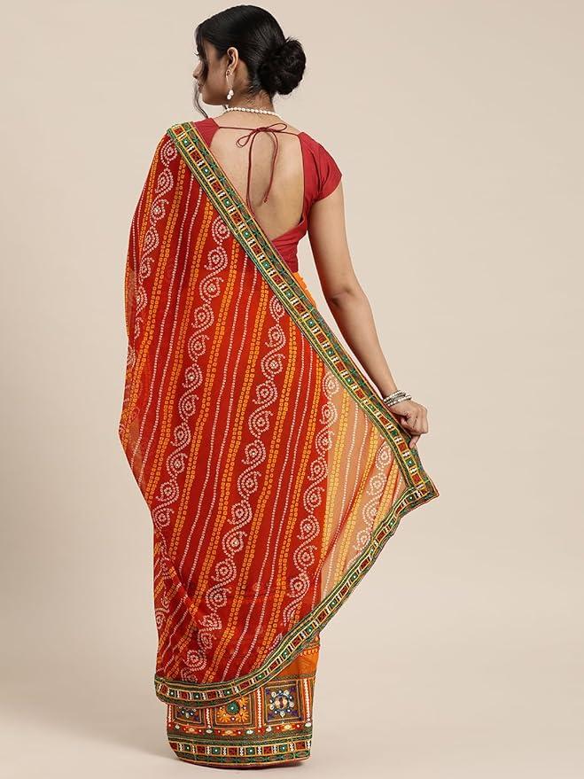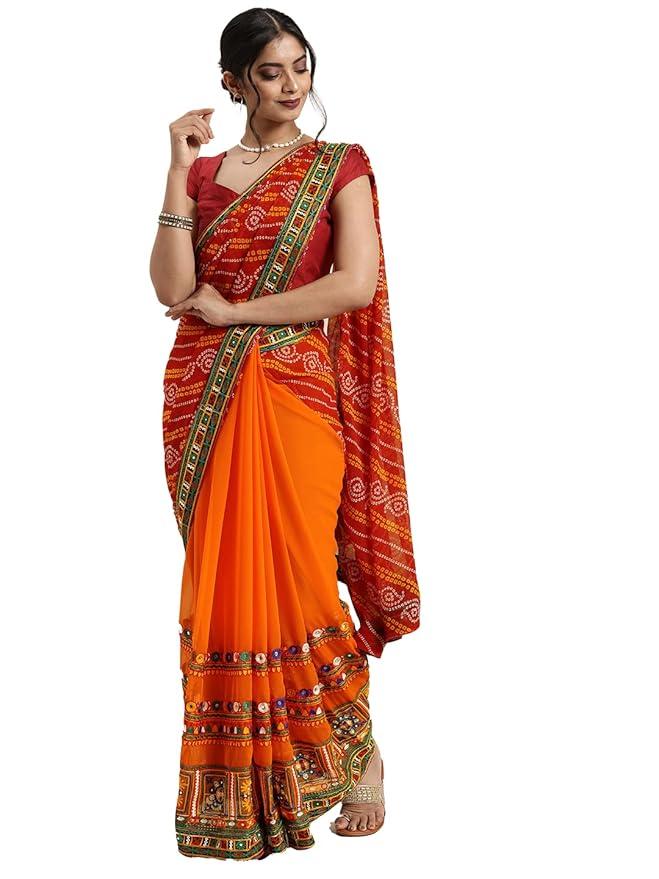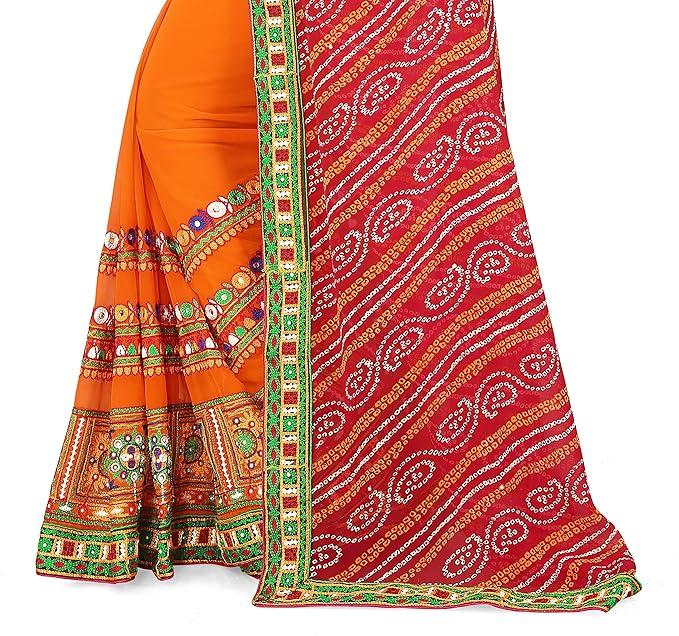 - Work : - This Georgette Bandhani Saree Half & Half is a modern take on traditional saree design, offering a perfect fusion of elegance and style. The saree is divided into two halves, with one side featuring the flowing Georgette Bandhani Print and the other adorned with Kutchi Embroidery Work.